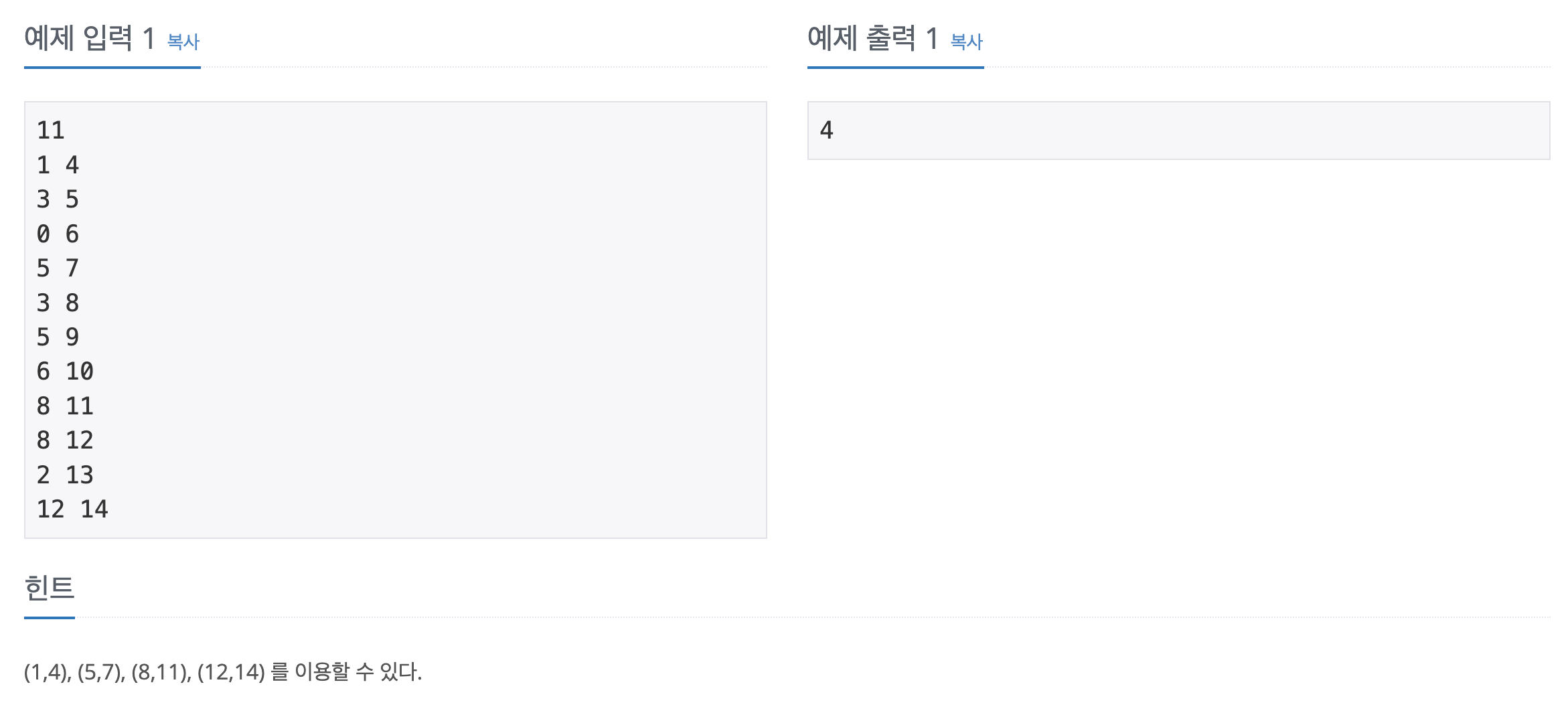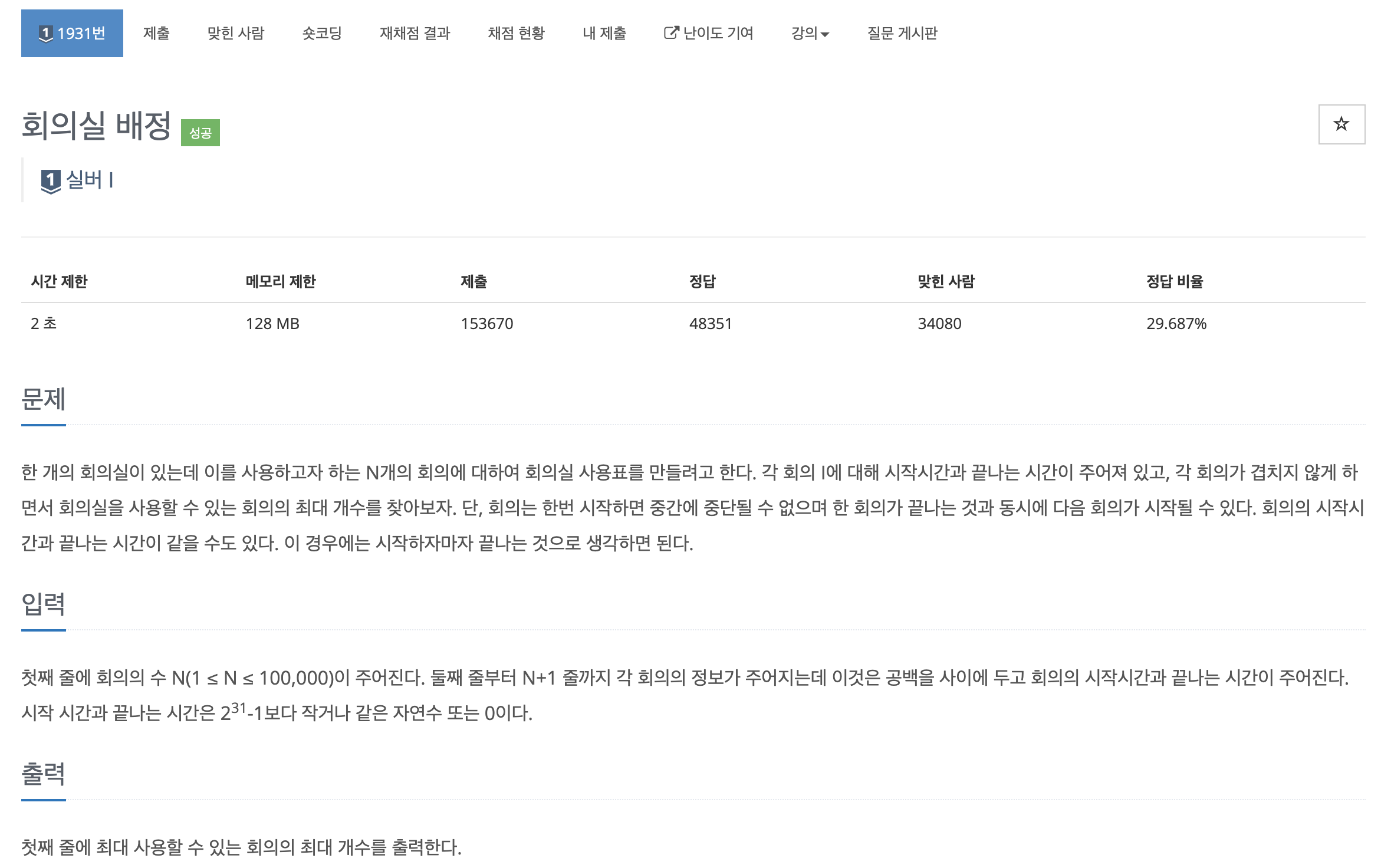 - 본 문제에선 시작 시간이 빨라도 끝나는 시간이 너무 늦어버리면 다음 회의를 하지 못하는 경우가 생길 수 있다. => 최대한 회의실을 사용하기 위해서는 끝나는 시간이 빨라야 한다.