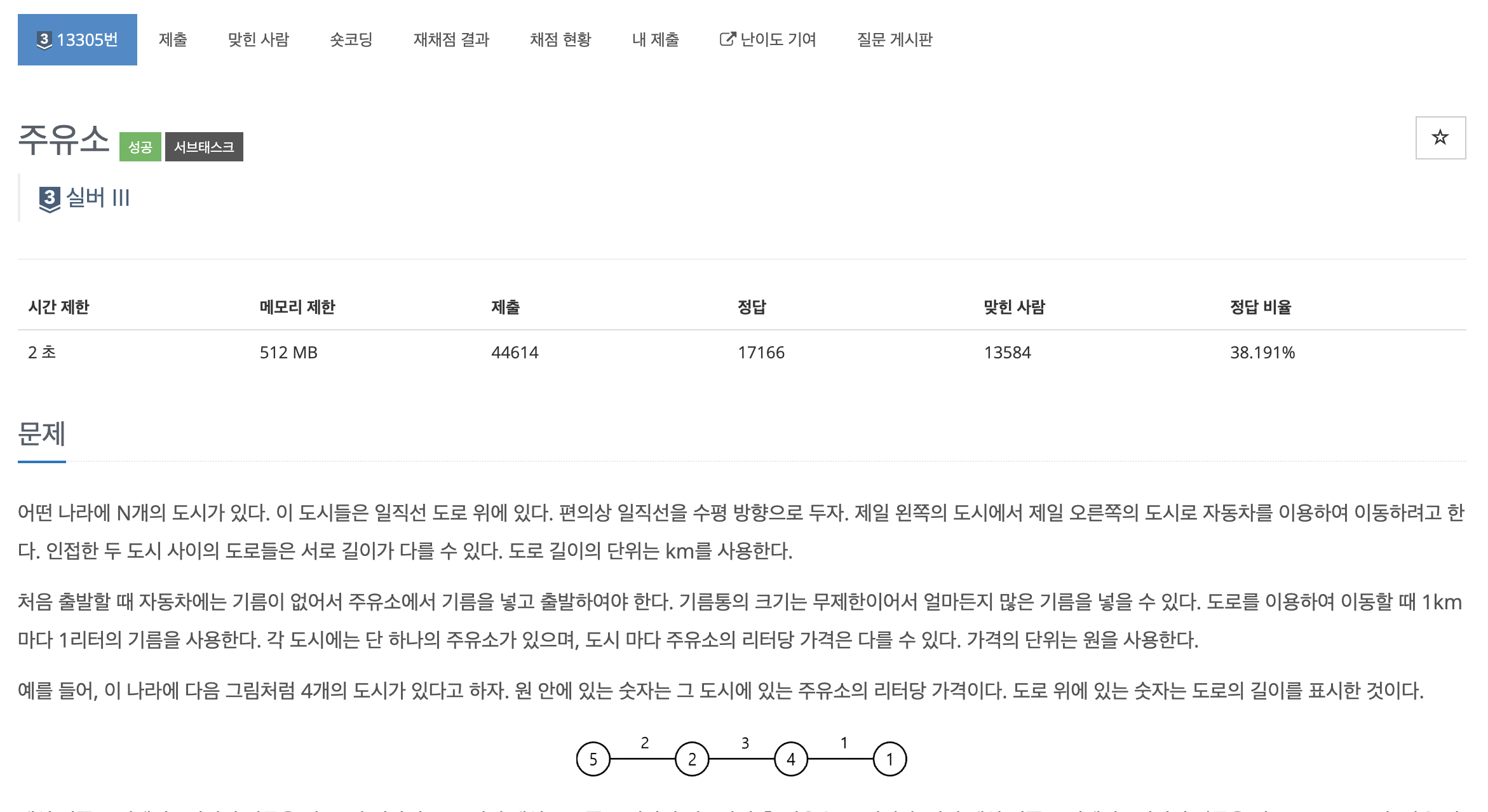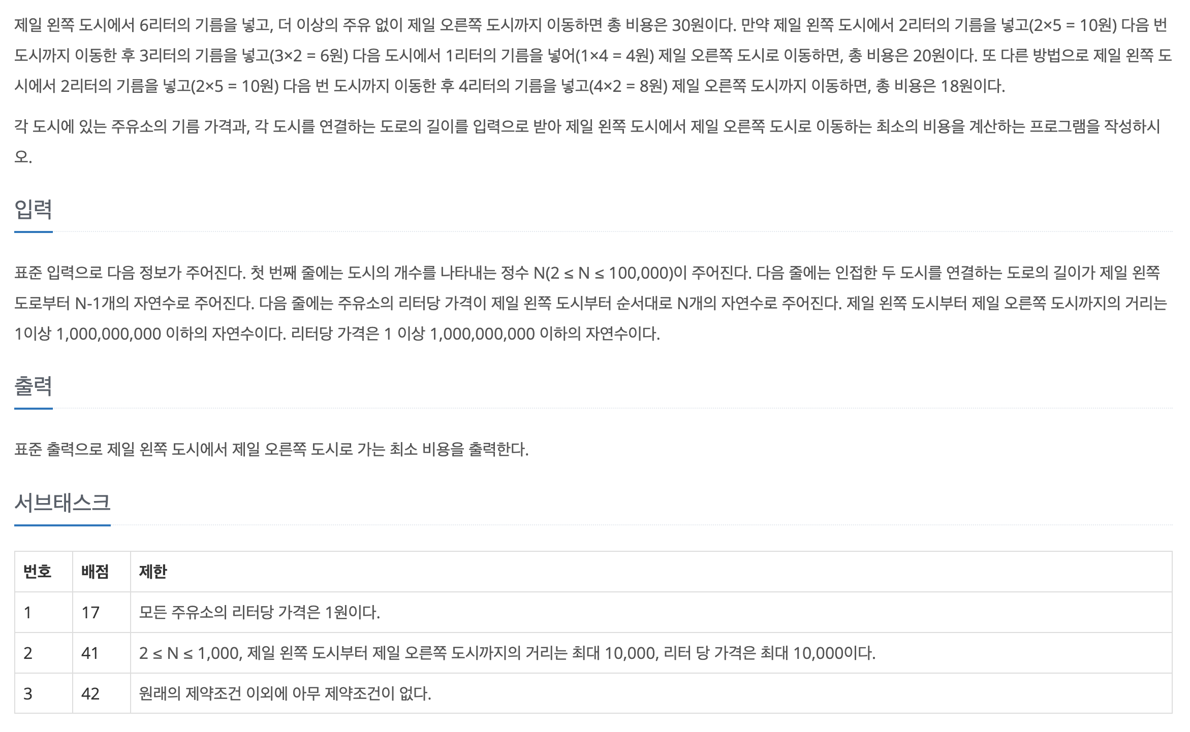 if(curPrice > charges[i+1]) curPrice = charges[i+1] // 현요금이 다음 주유소의 요금보다 비쌀경우 요금을 다음 주유소의 요금으로 갱신