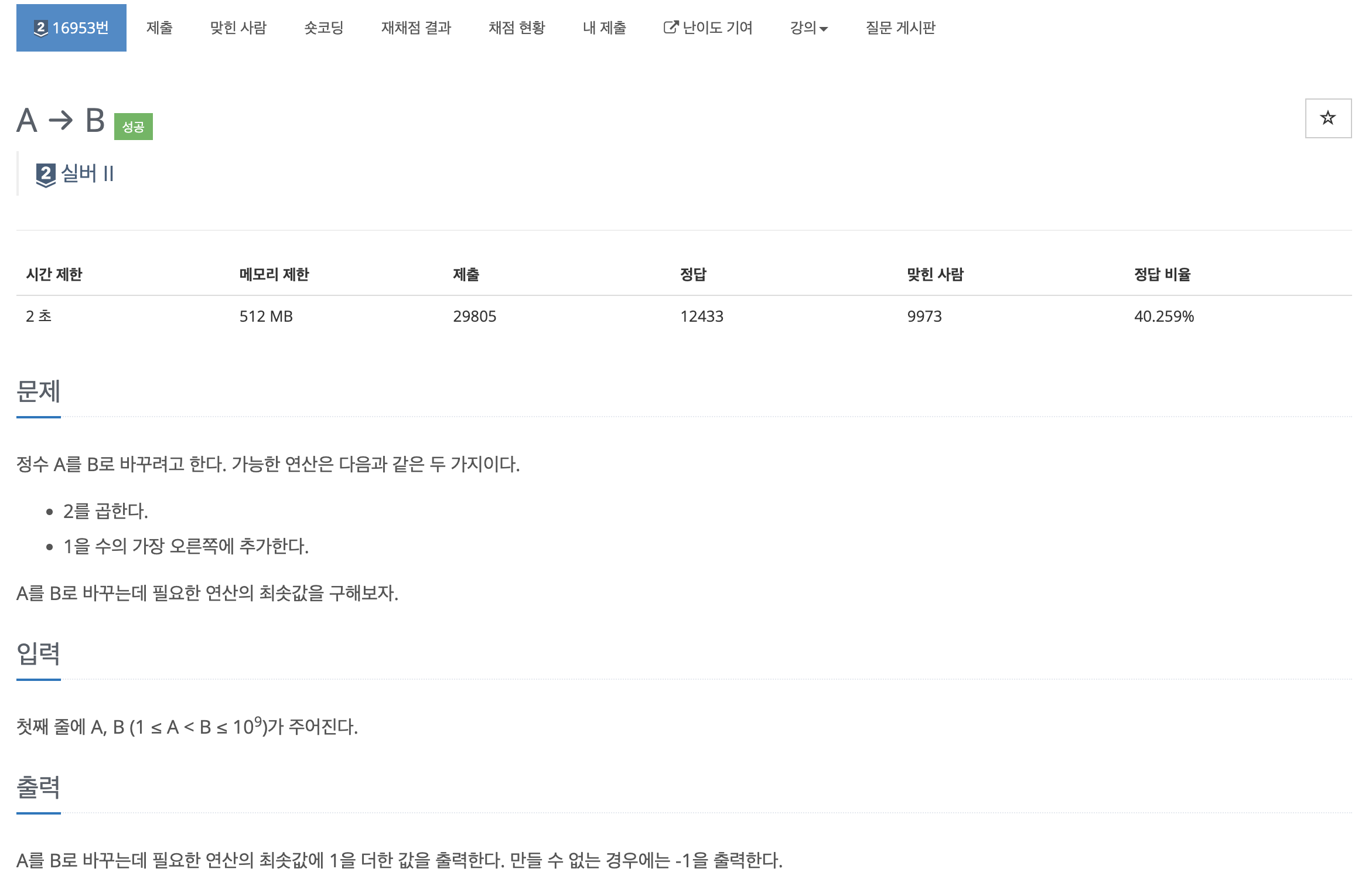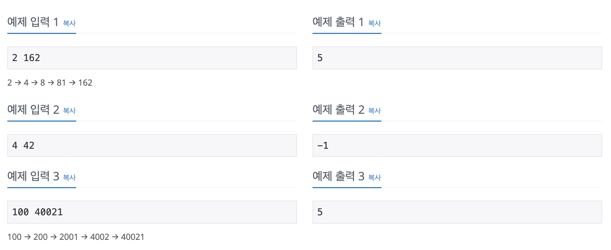 첫째 줄에 A, B (1 ≤ A < B ≤ 109)가 주어진다.