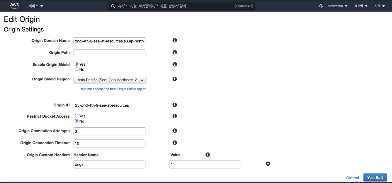 위 사진의 맨 아래쪽을 주의해서 보자. Origin Custom Headers라는 부분에 강제로 origin : "*"이라는 헤더를 S3에 보내도록 해놓았다.
