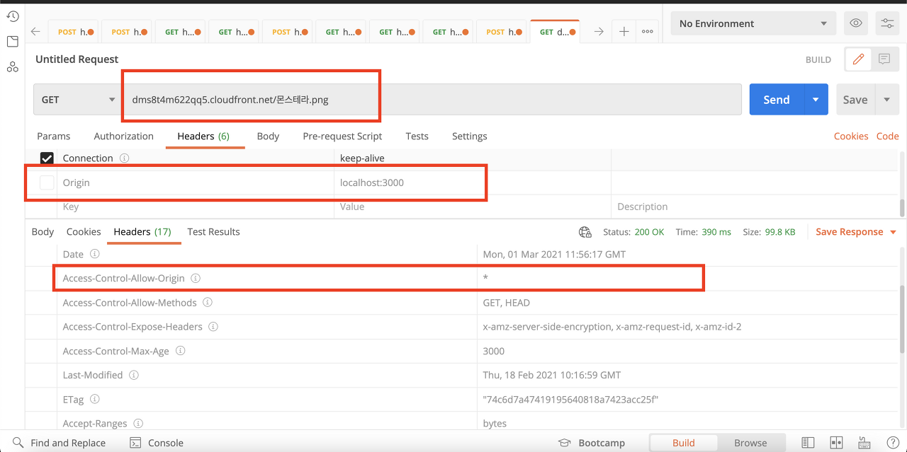 cloud front의 도메인(xxxx.cloudfront.net)으로 클라이언트에서 Origin 헤더 없이 요청해보고, access-control-allow-origin이 받아지는지 테스트 해보았다.