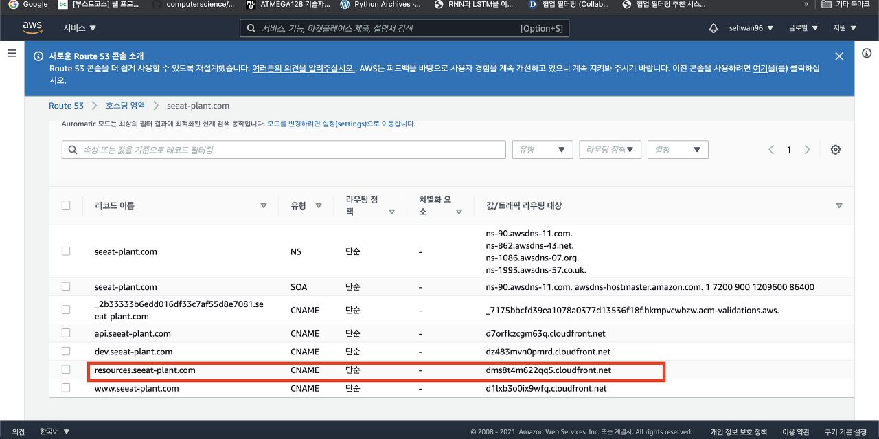 resources.seeat-plant.com으로 오는 요청을 cloud front 도메인으로 리다이렉션 하도록 Route53 설정을 변경하였다.