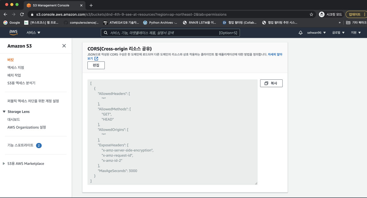 AWS 웹 콘솔에서 S3 CORS 활성화