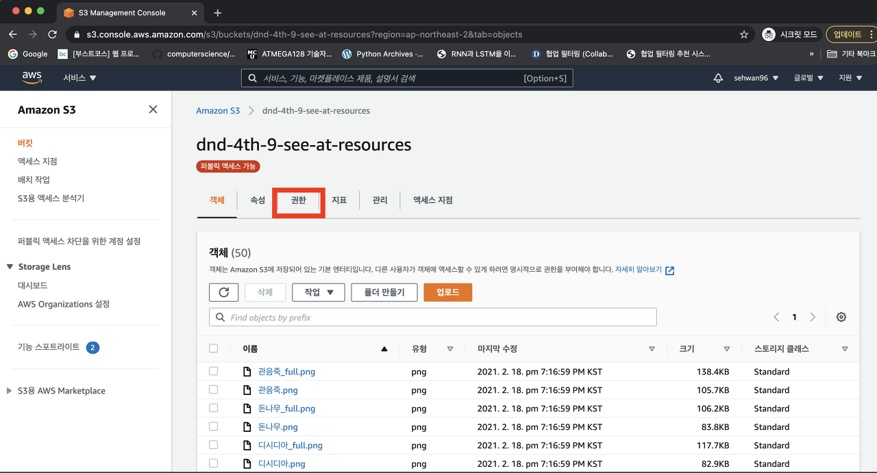 위 사진은 실제 이번 DND 4기 9조 사이드 프로젝트를 하면서 사용한 실제 S3 Static Resource 서버용 버킷이다.