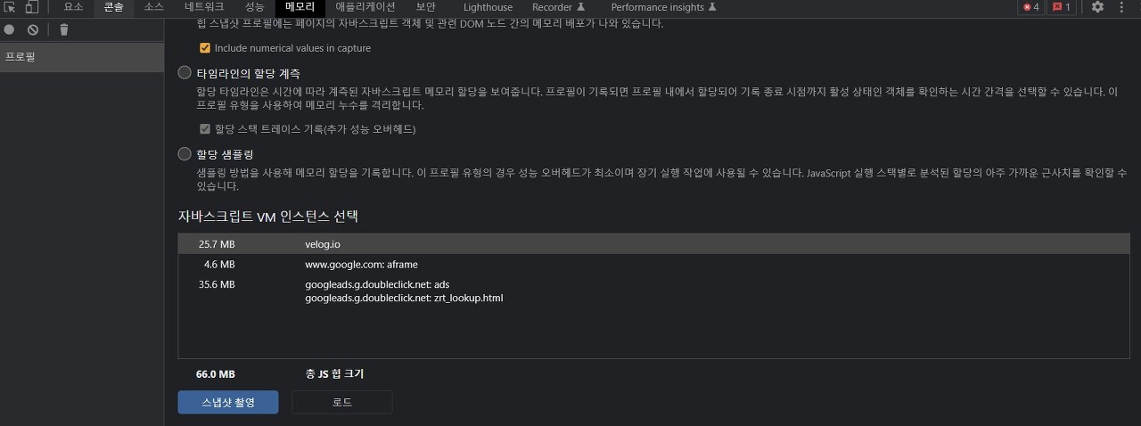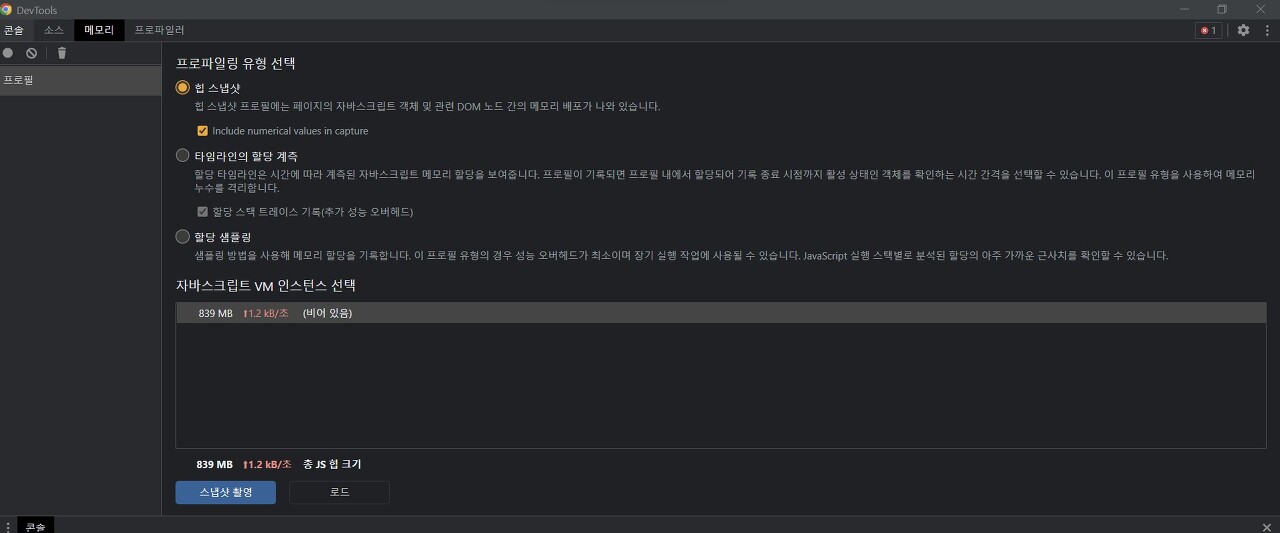 메모리/프로필에서 로드 버튼 눌러 앞서 만든 힙덤프 파일(snapshot) 올리기.